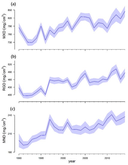 Maximum ((a), MXD), mean ((b), RDG) and minimum ((c), MND) wood density of Douglas fir in the Beamaburu site (1990–2014). The figure shows the mean and the 95% confidence intervals across individuals.
