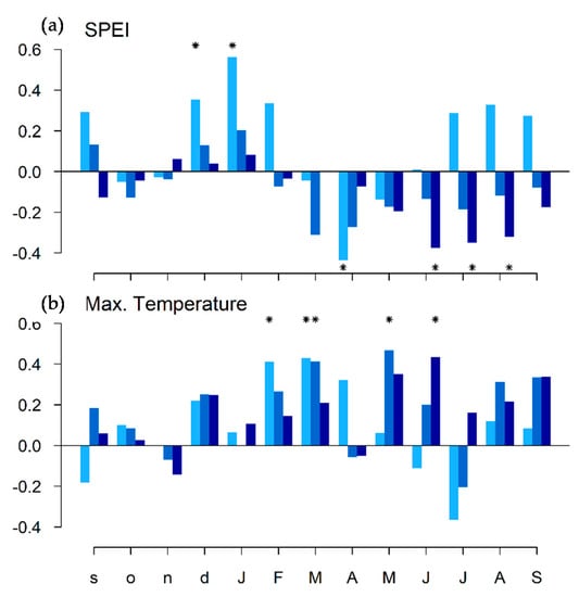 Relationship between Douglas fir wood density (detrended indices) and (a) monthly SPEI values and (b) mean maximum temperatures in the Beamaburu site. The relationships between minimum (MND, light blue bars), ring (RDG, medium blue bars) and maximum (MXD, dark blue bars) wood density are shown for September in the previous year (months abbreviated by lowercase letters) to September in the year of tree-ring formation (months abbreviated by uppercase letters). Significant relationships (p < 0.05) are shown with asterisks (*) for each variable.