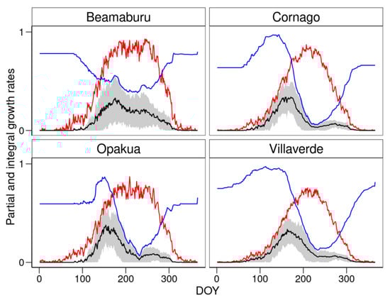 Simulated partial growth rates due to temperature (GrT, red lines) and soil moisture limitations (GrM, blue lines) and integral growth rates (Gr, black lines) averaged during the simulation period for each site. The grey lines show the standard deviations of the integral growth rates. DOY is the day of year.
