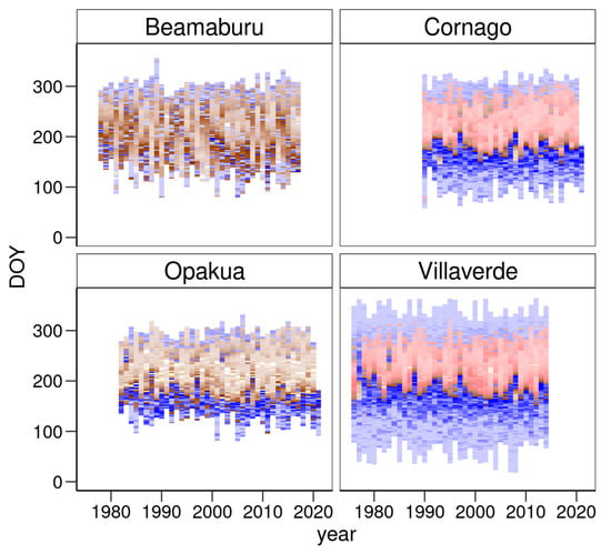 Climatic limitations of daily simulated partial growth rates (Gr) throughout the study periods in each site. When low temperature is the main limiting factor of growth (GrT < GrM), the colors of symbols are blue; if the main limiting factor is low soil moisture (GrT > GrM), then symbols are red; when soil moisture limits growth, symbols are brown; the white symbols show optimal climatic conditions (GrT = GrM = 1). DOY is the day of the year.