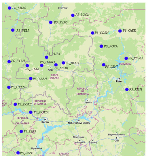 Schematic map of the location of the studied populations of P. sylvestris: PS_KOCh—Kochyovo; PS_SOSN—Gainy; PS_KISH—Kishert; PS_LENI—Kudymkar; PS_ChER—Cherdyn; PS_ROMA—Berezniki; PS_LOKC—Lokchim; PS_SYSO—Sysolsky; PS_KRAS—Krasnoborsk; PS_VELI—Velikoustyugsky; PS_PYSH—Pyshchugsky; PS_UREN—Urensky; PS_KORO—Korotni; PS_KOKSh—Kokshaysk; PS_KIRS—Kirsk; PS_INZE—Inzensky; PS_SHAB—Shabalinsky; PS_YEZH—Yezhikhinsk; PS_DARO—Darovskoy; PS_YURY—Yuryansky; PS_SLOB—Slobodskoy; PS_BELO—Belokholunitsky.