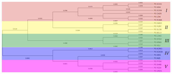 The smallest genetic distance was observed between populations PS_KOCh/PS_KISH (DN = 0.012), the largest (DN = 0.322) between populations PS_SOSN and PS_SHAB (Table S4). Based on the matrix of pairwise genetic distances (DN), a cluster analysis was performed using the Neighbor-joining method, and a dendrogram reflecting the degree of similarity in the ISSR profiles of the populations studied was constructed (Figure 2). In the dendrogram, the studied populations were divided into five clusters in accordance with their geographical location: East (I), Center (II), North (III), South (IV), and West (V).
