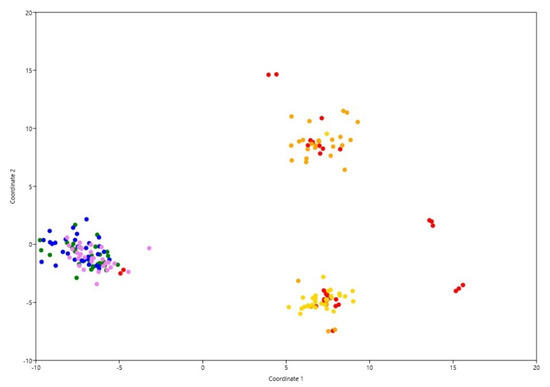 STRUCTURE analysis showed the presence of five groups of genotypes in the studied populations. The distribution of genotypes corresponds to the differentiation of populations according to the results of PCA analysis and the Neighbor-joining method (Figure S4).