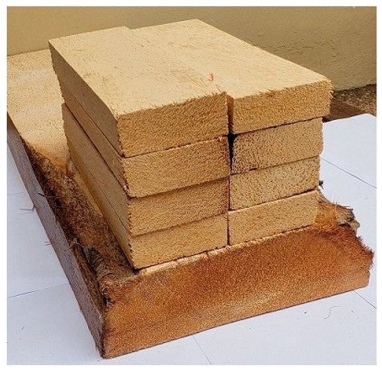 Forty (40)-year-old oil palm trunks were collected from a farm located in a wet, semi-deciduous forest zone in the western part of Ghana. Trunks were stout, straight, and about 550 to 610 mm in diameter. They were unproductive standing trees to be felled for a new plantation. The selected oil palm trunks were felled, and the local palm wine was tapped within 7 days, after which lengths of 4.5 m were extracted from the trunks from the bottom towards the top. These were converted into beams of dimensions 1000 mm × 320 mm × 100 mm and lumber of dimensions 1000 mm × 320 mm × 50 mm for the study. These dimensions were selected due to the size of the treatment bath.