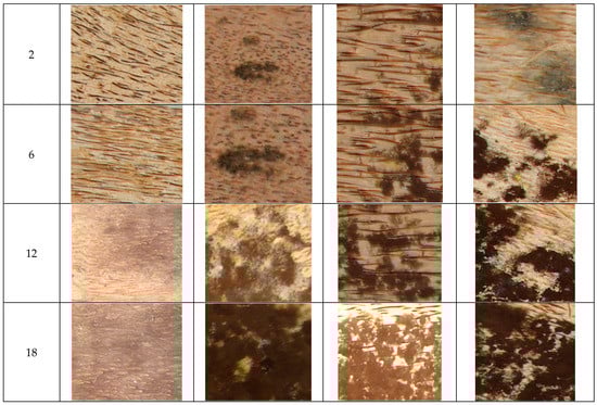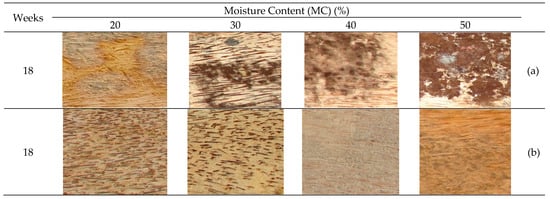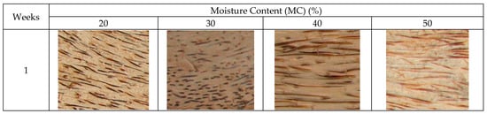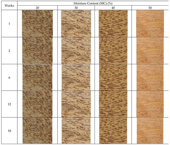 Figure 4 shows images of the original oil palm wood surfaces after they were immersed in tap water for 48 h, and thereafter immersed in Dursban 4E for another 48 h, after which the samples were conditioned in a kiln. It can be clearly observed that oil palm lumber surfaces were all clear, having no discoloration for all the moisture contents and at the 18-week duration. Tap water caused the disruption of sugar and starch pathways in the palm wood, which could have been the food for the discoloration fungi. This is because during the immersion of oil palm lumber, sugar and starch on the surfaces were washed quickly, and the water prevented the migration, deposition, and concentration of sugar and starch at the surface. Similar results were reported in other studies: in their study, [46] observed that water reduced surface discoloration. In contrast, discoloration was reported to be present at the wood’s surface by [47]. Ref. [48] emphasized that wood specimens treated with water greatly reduced the levels of fatty acids without any visual discoloration to the wood specimens. Ref. [49] used water to alleviate discoloration in wood. Ref. [50] highlighted that an effective method of eliminating wood biodeterioration attacks is to use water. The authors further recommended an approved Dursban application as the best.