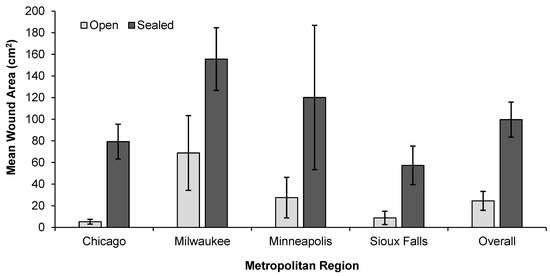 Mean total wound area by treatment and metropolitan region for open (plug-less) and sealed (plug) systems for emerald ash borer (Agrilus planipennis Fairmaire) treatment in green ash (Fraxinus pennsylvanica Marshall) trees. (Bars are SE, F(1, 363) = 17.406, p < 0.001).
