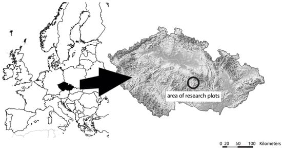 The research was conducted on acidic sites, i.e., Fageta piceoso-abietina or Fageta abietina-piceosa, due to the fact that a large proportion of these sites were occupied by secondary Norway spruce monocultures []. Selected research plots were represented by forest stands with a pure even-aged Norway spruce overstory that was tended by thinnings from below in young and mid-aged growing stages. Then in the growing stage of forest maturity, shelter-wood cuts of different intensities or gaps were created 15–25 years ago with no further silvicultural interventions since that time. The observations took place in the central part of the Czech Republic in the Bohemian–Moravian Highlands within altitudes of ca. 670–770 m above sea level (Figure 1). The soils of the research plots were determined as cambisols (mainly Eutric Cambisol; less often Dystric Cambisol or Areno-dystric Cambisol). The whole area lies in the geological entity of Moldanubikum with the typically prevailing acidic bedrocks of mainly amphibolite with veins of granodiorite or granite []. The mean annual air temperature is 4.9 °C; the mean annual precipitation is 850 mm with 55%–60% falling in the growing season [,], and the number of days when the snow cover is present usually ranges between 100 and 120 days [].