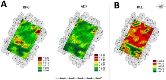 Example of visualized similarities between relative height growth (RHG) and apical dominance ratio (ADR) (A) and example of relative crown length (RCL) (B) of Norway spruce juveniles under a mature overstory canopy on the largest research plot Drtič (A). For all three indexes, a deep green color indicates highly suppressed growth regimes characterized by (i) short terminal length (as numerator in RHG and ADR); (ii) lateral crown growth encouraged by long branch length (as denominator in ADR); (iii) shortened crown length (as numerator in RCL).