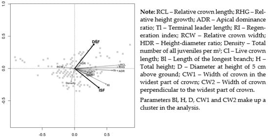 Redundancy analysis (RDA) was performed to investigate the effect of the main light components (direct and indirect—DSF and ISF) and the similarities within intensities of photo-morphological plasticity of different observed parameters and indexes. In this analysis, all measured parameters were included, as were indexes calculated for size-independent evaluation (i.e., regardless of height classes); the density was also included. RDA was performed with R software version 3.6.0 [] in R Studio version 1.2.1335 [] using the R package vegan [].