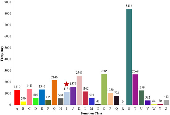 Histogram of clusters of orthologous groups (COG) classification according to the number of protein found in C. brasiliensis transcriptome. (A) RNA processing and modification; (B) Chromatin structure and dynamics; (C) Energy production and conversion; (D) Cell cycle control, cell division, chromosome partitioning; (E) Amino acid transport and metabolism; (F) Nucleotide transport and metabolism; (G) Carbohydrate transport and metabolism; (H) Coenzyme transport and metabolism; (I) Lipid transport and metabolism; (J) Translation, ribosomal structure and biogenesis; (K) Transcription; (L) Replication, recombination and repair; (M) Cell wall/ membrane/envelope biogenesis; (N) Cell motility; (O) Posttranslational modification, protein turnover, chaperones; (P) Inorganic ion transport and metabolism; (Q) Secondary metabolites biosynthesis, transport and catabolism; (R) General function prediction only; (S) Function unknown; (T) Signal transduction mechanisms; (U) Intracellular trafficking, secretion, and vesicular transport; (V) Defense mechanisms; (W) Extracellular structures; (Y) Nuclear structure; (Z) Cytoskeleton. The star highlights the category (I) Lipid transport and metabolism.