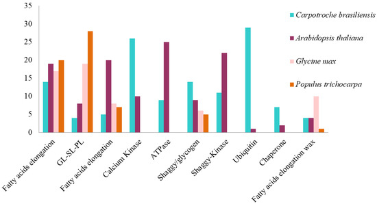 Furthermore, we identified clusters of lipid gene families, including orthologous genes among C. brasiliensis, A. thaliana, G. max, and P. trichocarpa. Consequently, it was possible to identify orthologous genes with common ancestry among different species, since these genes tend to preserve the function of their ancestor. One interesting example of orthologous groups involved in lipid metabolism was the family of the chaperone lipid genes (Figure 3). A previous study with the Chinese tallow tree (Triadiaca sebifera) evaluated proteins in lipid droplets of the fruit mesocarp, and numerous proteins were found related to signal transduction and activity similar to molecular chaperones [19]. Our results identified proteins with similar functions to chaperones, such as annexin D8, aspartic proteinases, bcl-2-associated athanogene (BAG), and aquaporin. Therefore, we believe that chaperones are important for the synthesis of lipids such as chaulmoogra oil in C. brasiliensis.