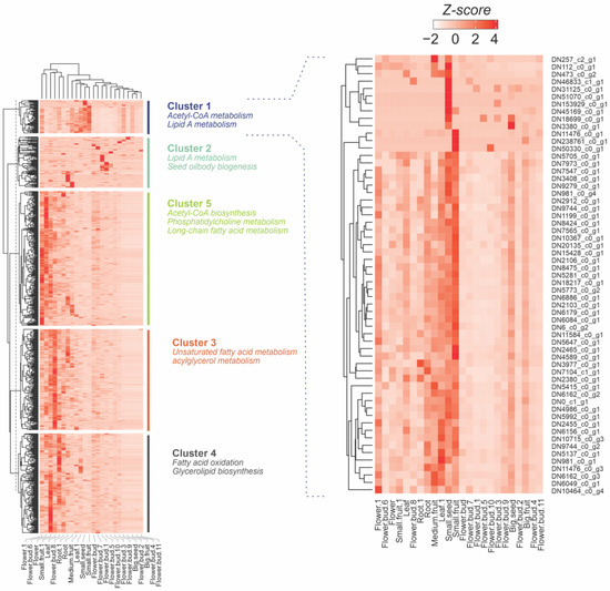 Heatmap of the analysis of the RNA-Seq transcriptome of 24 tissue libraries of Carpotroche brasiliensis. The heatmap of gene expression (Z-score) for 24 libraries, indicated by scale marks in the figure (columns) and lipids (lines). The color corresponds to the z-score per gene that is calculated from TPM (Transcripts Per Million). The redder the higher the expression values. The dendrogram shows the gene cluster according to the Euclidean distance. Five clusters represent the biological processes involved in lipid metabolism. Cluster 1, highlighted, represents the biological processes: lipid and acetyl-CoA metabolism and the genes that expressed Carpotroche brasiliensis libraries.