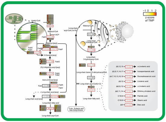 In terms of the synthesis of fatty acids in plastids, genes were regulated in libraries of immature and ripe fruits and seeds. For example, the genes for malonyl-CoA:ACP-S-malonyltransferase (FabD), Enoyl-ACP reductase (FabV), and Enoyl-ACP reductase II (FabK) have higher levels of expression in the tissues of immature seeds and fruits (Figure 5). On the other hand, in mature seeds and fruits, these genes are down-regulated.