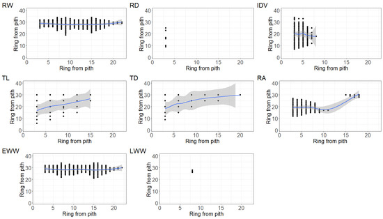 3.1. Inter-Ring Radial Variation at Breast Height