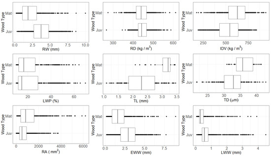 | Wood zone | RD (kg/m3) | IDV (kg/m3) | LWP (%) | RW (mm) | TD (µm) | TL (mm) | RA (mm2) | EWW (mm) | LWW (mm) |