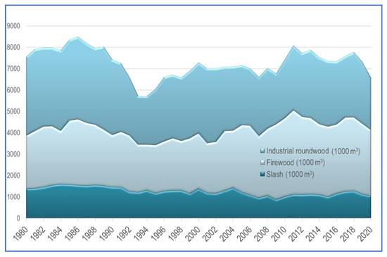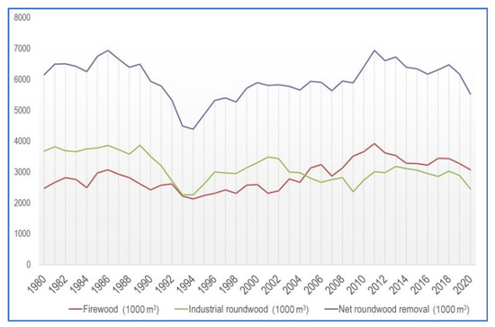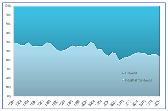 Although the amount of net roundwood removed from forests seems not to have had any increasing or decreasing trend in the 1980–2020 period, the amount of industrial roundwood removed is decreasing with the rising energy prices and the increasing firewood demand (Figure 2). In 1980, 60% of the net roundwood removed was industrial wood; however, by 2020 this ratio had decreased to 44% (Figure 3).