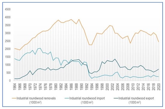Industrial roundwood removal, import, and export in time period of 1964–2020.
