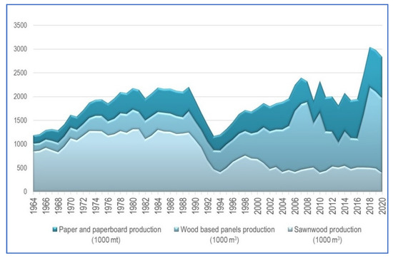 We revised the dataset published by Király and Kottek [18] and supplemented it with the EUROSTAT data for the production, import, and export of wood products. The data for the semi-finished wood products, which were originally taken from the National Data Collection Programme (OSAP), were replaced with more accurate data collected by the Central Statistical Office for the years 2005–2020.