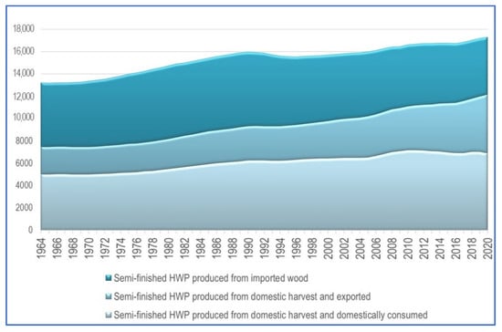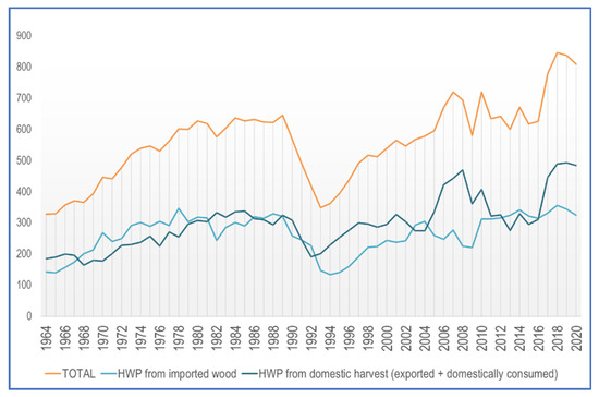 As shown in Figure 6, the total inflow to the HWP pool has an increasing trend, except for the years after the political regime change in 1990–1995. The share of the HWPs produced from domestically harvested wood has been increasing in the last decades.