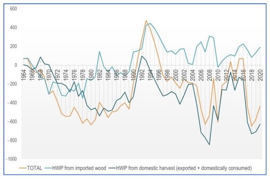 As shown in Figure 8, the HWP pool in Hungary is a carbon sink in most parts of the time series, with some years where it turns to a source of emissions, such as around the political regime change and in 2013–2016. The part of the HWP pool originating from the domestic harvest is producing bigger carbon removals due to the fact that in the past decades more HWPs were produced from imported raw materials than they are nowadays. This is also the reason why the HWP pool from the imported wood subcategory has been behaving as a source since 1989.
