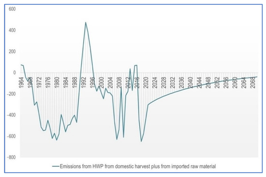 Our estimate is somewhat different from the data reported in the Hungarian GHGI because in the GHGI a conservative estimate is made in order not to overestimate the removals or underestimate the emissions. The Hungarian GHGI currently uses the methodology of the KP Supplement [19], and only the HWP pool from the domestic harvest is accounted for. The production dataset underlying this study is also different from the data used for the calculation in the GHGI. Under the KP, the HWP emissions and removals were accounted for against a Forest Management Reference Level (FMRL). The contribution of HWPs to the Hungarian FMRL was estimated based on the historic HWP production data derived from the TIMBER database for the years 1964–2009 and the harvest quantities projected by the Model GLOBIOM up to 2020. The HWP emissions and removals were calculated using the C-HWP-Model, which estimates delayed emissions on the basis of the annual stock change of semi-finished wood products [16]. The average projected HWP emissions for 2013–2020 were incorporated into the FMRL. Following the due technical correction of the FMRL, as required by paragraphs 14 and 15 of the Annex to Decision 2/CMP.7, the average estimated HWP removal for 2013–2020 was −45 kt CO2. Our estimate for the average removal of this period for domestically harvested wood products is −413 kt CO2. The estimated carbon removal is larger than the one incorporated in the FMRL due to several effects, i.e., the difference in the production database, which has been updated; the difference between the actual harvest rates and the harvest projection; and the difference in the calculation methodology.