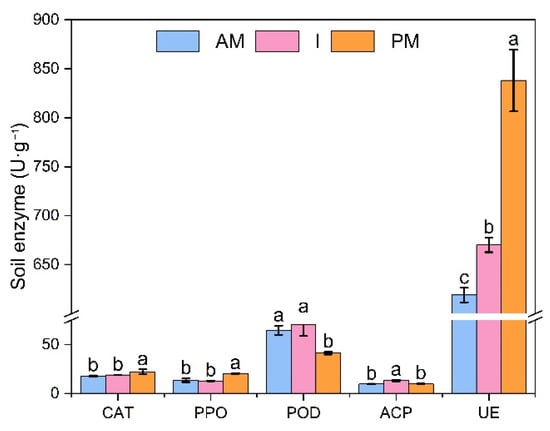 Soil enzyme activity under different cropping patterns. Different letters indicate significant differences (ANOVA, p < 0.05, and Tukey’s HSD post hoc analysis) among different planting modes. AM represents areca nut monocropping; I represents areca nut intercropping with pandan; and PM represents pandan monocropping. Different lowercase letters indicate significant differences between treatments under the same index (p < 0.05).
