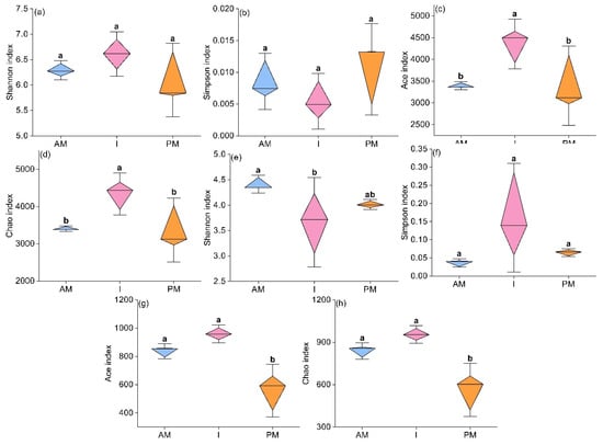 Changes in soil microbial alpha diversity index under different planting patterns ((a–d): bacteria; (e–h): fungi). Different letters indicate significant differences (ANOVA, p < 0.05, and Tukey’s HSD post hoc analysis) among different planting modes. AM represents areca nut monocropping; I represents areca nut intercropping with pandan; and PM represents pandan monocropping. Different lowercase letters indicate significant differences between treatments under the same index (p < 0.05).