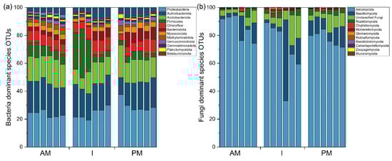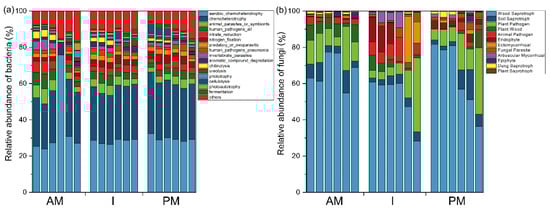 Soil microbial community composition under different planting patterns ((a)-bacteria, (b)-fungi). The abundance of each taxon was calculated as the percentage of sequences per gradient for a given microbial group. AM represents areca nut monocropping; I represents areca nut intercropping with pandan; and PM represents pandan monocropping.