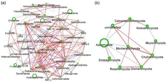 Network interaction diagram of dominant bacterial (a) and fungal (b) phyla. The line between the circles indicates that there is a correlation, red lines indicate a positive correlation, while the blue lines show a negative correlation. The size of the points represents the magnitude of phyla abundance, while the thickness of the line represents the correlation size. Each circle represents a microbial phylum. Red indicates a positive correlation, and blue indicates a negative correlation (p < 0.05).