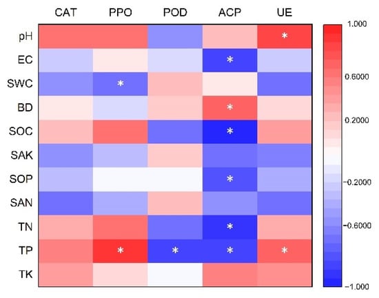 Relationship between soil environmental factors and soil enzyme activities. * Correlation is significant at the 0.05 level. Red indicates a positive correlation and blue indicates a negative correlation, and the darker the color, the stronger the correlation. Electrical conductivity (EC), soil water content (SWC), soil bulk density (BD), soil organic carbon (SOC), soil-available potassium (SAK), soil-available phosphorus (SAP), alkali-hydrolyzed nitrogen (SAN), total nitrogen (TN), total phosphorus (TP), total potassium (TK), soil catalase (CAT), soil polyphenol oxidase (PPO), soil peroxidase (POD), soil acid phosphatase (ACP), and soil urease (UE). Same below.