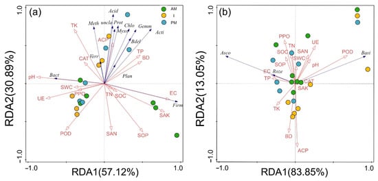 Ordination plots of the results from the redundancy analysis (RDA) to identify the relationships among the microbial (bacterial and fungal) taxa (blue arrows) and the soil properties and enzyme activities (red arrows) at the phylum level. (a) Relationships between soil bacterial communities and environmental variables and (b) relationships between soil fungal communities and environmental variables. Bacterial taxa: Proteobacteria (Prot), Actinobacteriota (Acti), Acidobacteriota (Acid), Firmicutes (Firm), Chloroflexi (Chlo), Bacteroidota (Bact), Myxococcota (Myxo), Methylomirabilota (Meth), Verrucomicrobiota (Verr), Gemmatimonadota (Gemm), Planctomycetota (Plan), and Bdellovibrionota (Bdel). Fungal taxa: Ascomycota (Asco), Rozellomycota (Roze), and Basidiomycota (Basi). Soil properties: electrical conductivity (EC), soil water content (SWC), soil bulk density (BD), soil organic carbon (SOC), soil-available potassium (SAK), soil-available phosphorus (SAP), alkali-hydrolyzed nitrogen (SAN), total nitrogen (TN), total phosphorus (TP), total potassium (TK), soil catalase (CAT), soil polyphenol oxidase (PPO), soil peroxidase (POD), soil acid phosphatase (ACP), and soil urease (UE). Same below.