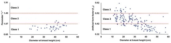 Even when not meeting the sample intensity in all the diametric classes, according to Kozak [], the estimates of the taper equations’ parameters are simple and can be estimated with any multiple regression program with about 60 to 100 trees. Nevertheless, twenty trees in each class were selected to establish a rectangular distribution of frequencies in the DBH classes. This procedure is justified by the coincidence of the mean and center of each class, which implies the disappearance of the rounding error [].