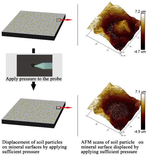 Schematic diagram of a probe approaching uniformly close soil particles on a mineral surface. Changes in the morphology of the mineral surface was observed and recorded by tapping the soil particles with an atomic force microscope probe.