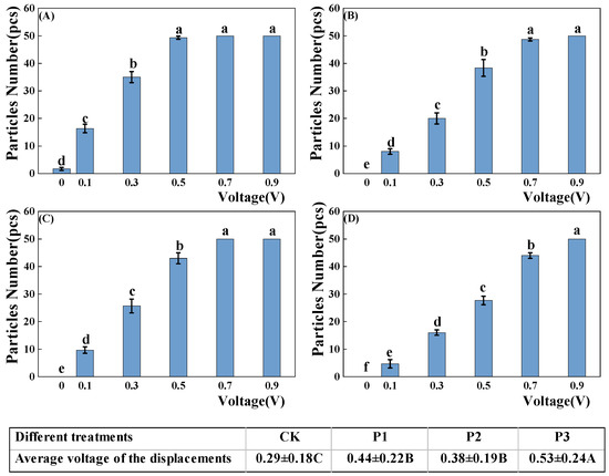 The number of soil particles displaced on mineral surfaces of indoor experiments. (A) The number of soil particles displaced at different voltages for the control group; (B) The number of soil particles displaced at different voltages for P1; (C) The number of soil particles displaced at different voltages for P2; and (D) The number of soil particles displaced at different voltages for P3. Different capital letters denote significant differences (p < 0.05) between various treatments based on a one-way analysis of variance and the Duncan test. Different lowercase letters denote significant differences (p < 0.05) between different voltages applied to the same bacteria.