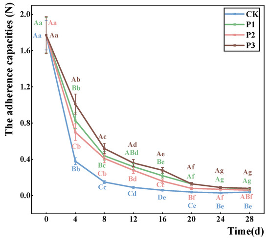 Soil’s adherence to the minerals in the pot experiment. Different capital letters indicate a significant difference (p < 0.05) across treatments simultaneously based on a one-way analysis of variance and the Duncan test. Different lowercase letters denote significant differences (p < 0.05) between different timepoints applied to the same bacteria.