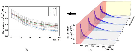 Although the soil’s moisture content gradually dropped, the treatments consistently added more bacteria than CK (Figure 5). The CK would reach a severe drought on day 4 (8% soil volumetric water content), whereas P1, P2, and P3 would reach a severe drought on days 8, 8, and 9, respectively.