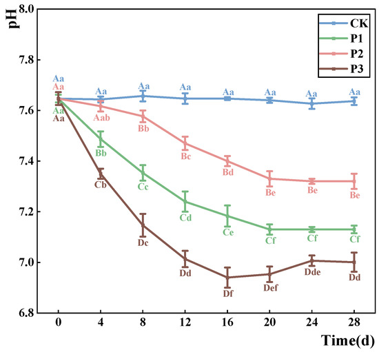 The bacteria treatments caused the soil pH to be significantly lower than the CK (Figure 6). In contrast to CK, where there was no significant change in soil pH, P3’s soil pH initially decreased, then increased over time, and finally stabilized at 7.0.