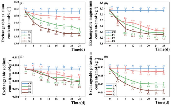 Soil exchangeable metal ion content with different soil bacteria. (A) Changes in exchangeable calcium ions in soil for various treatments; (B) Changes in exchangeable magnesium ions in soil for various treatments; (C) Changes in exchangeable sodium ions in soil for various treatments; (D) Changes in exchangeable potassium ions in soil for various treatments. Different capital letters denote significant differences (p < 0.05) between treatments simultaneously based on a one−way analysis of variance and the Duncan test. Different lowercase letters denote significant differences (p < 0.05) between different times applied to the same bacteria.