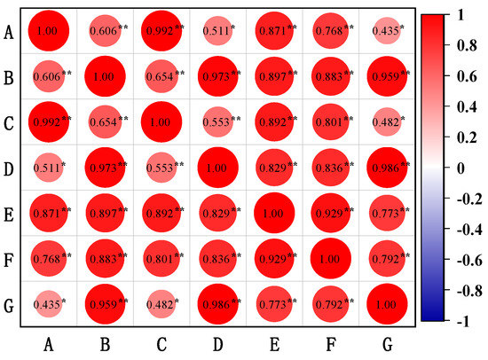 Correlation analysis of soil characteristics and soil adherence to minerals. The numbers in the circles represent the correlation coefficients between the parameters. ** and * indicate significant differences at p < 0.01 and p < 0.05, respectively. A, soil adhesion to minerals; B, soil pH; C, soil moisture content; D, soil exchangeable calcium ions; E, soil exchangeable magnesium ions; F, soil exchangeable sodium ions; G, soil exchangeable potassium ions.