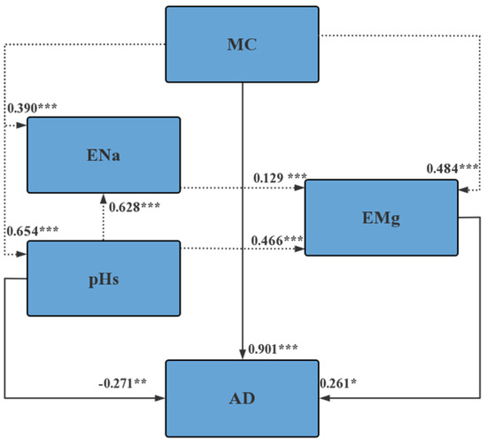 Structural equation model of soil characteristics affecting the soil adhesion to minerals. p = 0.324 > 0.05, GFI = 0.952 > 0.900, RMSEA < 0.08. Standardized path coefficients are shown as numbers on arrows. Solid lines indicate the direct influence of each parameter on the adhesion of soil to minerals, and dotted lines indicate the indirect influence of each parameter on the adhesion of soil to minerals. ***, **, and * indicate significant differences at p < 0.001, p < 0.01, and p < 0.05, respectively. AD: adhesion of soil to mineral; pHs: soil pH; MC: soil moisture content; EMg: soil exchangeable magnesium ions; and Ena: soil exchangeable sodium ions.