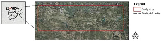 The study area is located in the northwest of the Iberian Peninsula, coinciding with a rectangle of 110 × 33 km that includes the central–western sector of the Cantabrian Mountains (Figure 1).