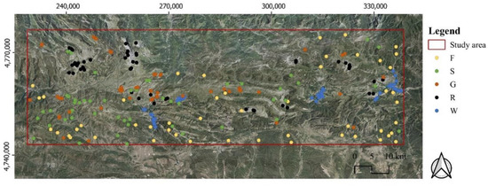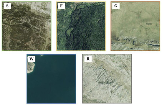 According to the classes of habitats identified in the study area in previous work [10], five classes were considered for elaboration in this study: shrubland (S), forest (F), grassland (G), water (W), and rock and bare soil (R). These types of habitats were visually identified in available orthophotographs of the study area (Figure 2). The habitats intermingle at a fine scale across the entire study area, with a predominance of forests on the northern face of the mountain range.