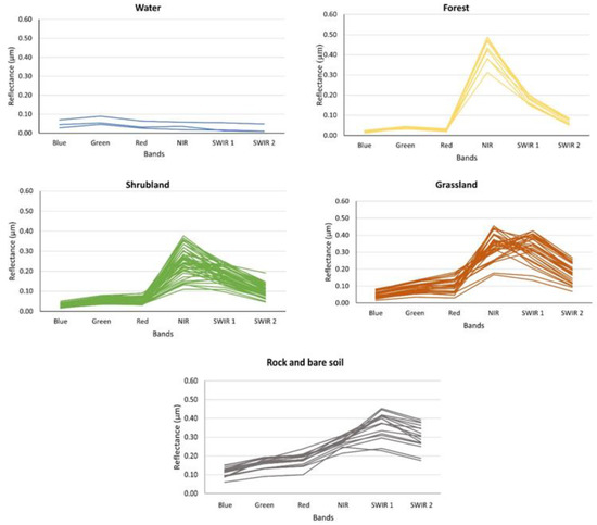 We observed that the optimized spectral libraries included a greater number of endmembers for the classes of shrubland (48 endmembers), grassland (31 endmembers), and rock and bare soil (16 endmembers) than for the classes of water (3 endmembers) and forest (9 endmembers).The reflectance peaks for classes such as forest and shrubland are mainly in the near-infrared range, whereas in the case of the grassland class, peaks appear in the near-infrared and short-wave infrared (SWIR 1) ranges. For the rock and bare soil class, the wavelength in the blue and green bands, i.e., between 0.10 and 0.20 µm, is greater than that of the rest of the classes, which is found between 0 and 0.10 µm. The reflectance peak for this class is in the SWIR 1 range. For the water class, none of the bands has a reflectance value greater than 0.10 µm.