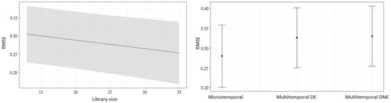 The panel on the left shows the mean predicted RMSE values (±95% confidence intervals) depending on library size: the abscissa axis reflects the number of spectral signatures as the size of the spectral library, and the ordinate axis represents the predicted RMSE value. The panel on the right shows the mean predicted RMSE values (±95% confidence intervals) depending on library type: the abscissa axis reflects the type of spectral library (monotemporal, multitemporal with equitable distribution (Multitemporal_DE), or multitemporal with inequitable distribution (Multitemporal_DNE)).