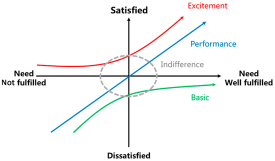 Kano developed his model to define a product or service’s quality on the basis of how well it satisfies customers’ or users’ needs. In Kano’s model, users’ needs are categorized into five groups: Attractive/Excitement Quality (A), One-dimensional/Performance Quality (O), Must-be/Basic Quality (M), Indifferent Quality (I) and Reverse Quality (R) [24]. In addition, there is a Question Option (Q), which usually does not appear unless the question of Kano questionnaire itself is wrong or the user understands it incorrectly (Table 1). Basic attributes are the minimum required features that customers naturally expect from a product or service for fulfilling the basic functions of a product; when they are not present, customers will be entirely dissatisfied [25,26]. Performance attributes produce both satisfaction and dissatisfaction depending on performance levels, and satisfaction is proportional to the level of fulfillment of these attributes. In a nutshell, if these attributes are not designed, customers will be unhappy, while full satisfaction of these requirements would result in customer satisfaction [27]. Excitement attributes are key factors for customer satisfaction, which can be described as surprise and delight attributes that produce satisfaction when delivered but cause no dissatisfaction if not delivered [28] (Figure 1). Indifferent attributes refer to aspects that are neither good nor bad, and they do not result in either customer satisfaction or customer dissatisfaction. Reverse attributes refer to a high degree of achievement resulting in dissatisfaction and to the fact that not all customers are alike.