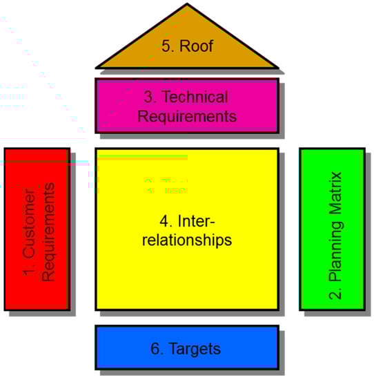 QFD utilizes the house of quality (HOQ), which is a matrix providing a conceptual map for the design process, as a construct for understanding customer needs and establishing priorities of technical requirements to satisfy them [29]. Figure 2 presents a schematic diagram of the house of quality (HOQ) of QFD, which consists of the left wall, ceiling, roof, room, floor, right wall, and other aspects. Six major steps are required to complete this matrix: the determination of the (1) customer needs (“WHATs”), (2) planning matrix, (3) technical requirements (“HOWs”), (4) inter-relationship matrix between WHATs and HOWs, (5) technical correlation matrix for the roof, and (6) technical matrix for targets.