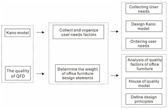 At present, research on office space furniture focuses on green practices in planning and designing to improve the efficiency and comfort of office furniture. Matthew recommended that such planning remains a key item for the improvement of office capabilities so as to facilitate upgrading office furniture through green practices in planning and related correspondence with clients [1]. In the shared workspace, Viola offered an inventive furniture system with soundproof panels that leverages smart materials to fulfill users’ needs for acoustic comfort [6]. Research also focuses on translating customer needs into designing essential factors to satisfy them. Andreja argued that such an approach cultivates experience regarding appropriate configurations as indicated by shopper inclinations and perspectives, constituting a significant factor in the production of wooden furnishings [7]. Masaji evaluated individuals’ shopping conduct regarding wooden furniture to determine clients’ utilization goals for feasible furnishings [8]. Choodoung offered a systematic examination of the design process, design assessment, and design-dependent elements of wooden furniture based on user experience and used the dining armchair as a case study [9]. Ye researched the development of modular children’s furniture using scene theory to better clarify the interaction between products, users, and their requirements [10]. Wang employed the analytical hierarchy process (AHP) to prioritize the functional order of the office furniture’s features, such as height adjustment, sedentary reminders, and lighting adjustments [11]. Lastly, research focuses on the analysis and exposition of the necessity and trends of furniture design in office space. Didem considered it critical for science and technology to make advances in this field in order to accommodate the evolving requirements and diverse expectations of the new generation of flexible office furniture. Open office furniture is designed with lightness, mobility, deformability, acoustics, and adaptability to new technology in mind [12]. Managing space, communicating, collaborating, and sharing would be the primary goals of the future office, according to Fan, who stated that the varied development of society has broken down the isolation of office furniture and raised the importance of user experience [13]. According to the actual needs of users, the dynamic and static dimensions, and many unique use scenarios, Liu investigated and optimized the design of office chairs [14]. However, the literature lacks relevant reports on effective approaches to wood desk designs for open-plan offices. The Kano model and quality function deployment (QFD) technology has been used in manufacturing and the service industry. This paper explored a hybrid integration approach combining two models for wood desk designs for open-plan offices. The Kano model was created by Noriaki Kano, a Japanese quality management expert, and was developed as a means to determine users’ demand attributes. QFD is a customer-oriented tool that provides the path for translating customer voice or needs into product specification [15]. Quality function deployment (QFD) was first introduced into Japanese manufacturing enterprises; later, QFD technology was commonly adopted by enterprises in Europe and the United States. QFD is a powerful tool for translating customer requirements into technical specifications, and it is frequently used in the design of products and services [16]. QFD was first introduced by Akao in 1972 at Mitsubishi’s Kobe shipyard site, and then Toyota and its suppliers developed it further for a rust prevention study [17]. After the concept of QFD was introduced in the US through auto manufacturers and parts suppliers [18], many US firms, such as AT&T, Digital Equipment, Ford, GM, Hewlett-Packard, Procter & Gamble, and Raychem, applied QFD to improve product development and communication [19,20].