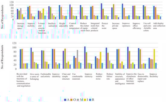 According to the Kano–QFD integration model, the importance value can be determined. The first six items are sorted by their Wi values: B23 office efficiency improvement design (Wi = 223.69) > B35 low failure rate design (Wi = 201.11) > B37 flexible design (Wi = 190.66) > B11 storage space design (Wi = 184.93) > B31 material artistic design (Wi = 178.83) > B14 multifunctional intelligent office design (Wi = 173.73) (Figure 8). As Tuncel and Hande stated, the development of information technology has led to office work being performed in new ways [12]. Modern office furniture design pushes two concepts to an extreme: communication and efficiency. With the development of information systems, the emergence of the Internet, and the spread of e-mail, office workers have actually become “free movers”, and office furniture design has begun to consider issues such as wiring, power, and portability. The use of electronic devices has increased, and the sharing of information has become widespread. As a consequence, priorities and needs have changed toward flexible furniture systems that support alternative uses of space [12,13]. The integrated model analysis led to a final design aim that actually prioritizes efficiency, complexity, and versatility. Designers should treat data models dialectically when designing wood desks for open-plan offices so as to aim for clerical office furniture designs that promote high user satisfaction. Similarly, Rolfö discovered through interviews with employees in some organizations that had switched to activity-based flexible offices that employees’ perceived performance and satisfaction with their actual work had indeed improved, and a conceptual model of design implementation was proposed [32]. Big data have also been gradually applied to the field of office design. By tracking the utilization rate of office space and office furniture, it is possible to improve the effective utilization of office space and afford employees a better office experience. In order to analyze office furniture using anthropometric data from sitting positions, Amira examined postural deficits from an anthropological perspective, along with a consideration of ergonomic factors [33]. In a study of the impact of digitization on office furniture, Simecomi likewise proposed an arrangement of customizable and astutely planned workbenches [34]. Intelligent office furniture that incorporates technologies such as the Internet of things, sensors, and smart chips affords unlimited possibilities for meeting human needs in all directions. Compared with traditional office furniture, smart office furniture has established more relationships with people, which has enriched and complicated the interactive experience process between users and products.