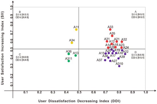User satisfaction is measured by the user satisfaction increasing index (SII) and user dissatisfaction decreasing index (DDI), as shown in Table 5. These SII and DDI indices of the Kano model can describe those requirements that really bring differentiation to the wood desk design in an open-plan office, as well as identify those requirements that users view unfavorably. This paper also makes use of the adjusted improvement ratio k, which can take the values 0, 0.5, 1, and 1.5, and the corresponding four requirements of indifferent qualities (I), basic qualities (M), performance qualities (O), and excitement qualities (A). This approach has proved very useful in identifying user demands more conveniently and can help to enhance the level of customer satisfaction by indicating appropriate modifications. The user satisfaction increasing index (SII) and user dissatisfaction decreasing index (DDI) were statistically analyzed and plotted along the coordinate axes (Figure 5). SII was plotted on the portion of the Y-axis ranging between 0 and 1, while DDI was plotted on the X-axis between 0 and 1. We divided the axes at the values of 0.5 to obtain four quadrants: the first (red), second (yellow), third (green), and fourth (purple), corresponding to A, B, C, and D.