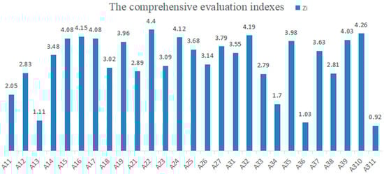 The user satisfaction ideal improvement index directly affects the priority of a certain demand factor of wood desks. The comprehensive evaluation index (Zi) of users’ demand degree of wood desk is derived from the values of SII, DDI, Kano classification results, and Vi and Hi from the comprehensive calculation. The comprehensive evaluation index of users’ demand for features of office furniture was calculated as shown in Figure 6. The final value Zi of Kano model was input into the QFD house of quality to identify important design points, as shown in Table 6.